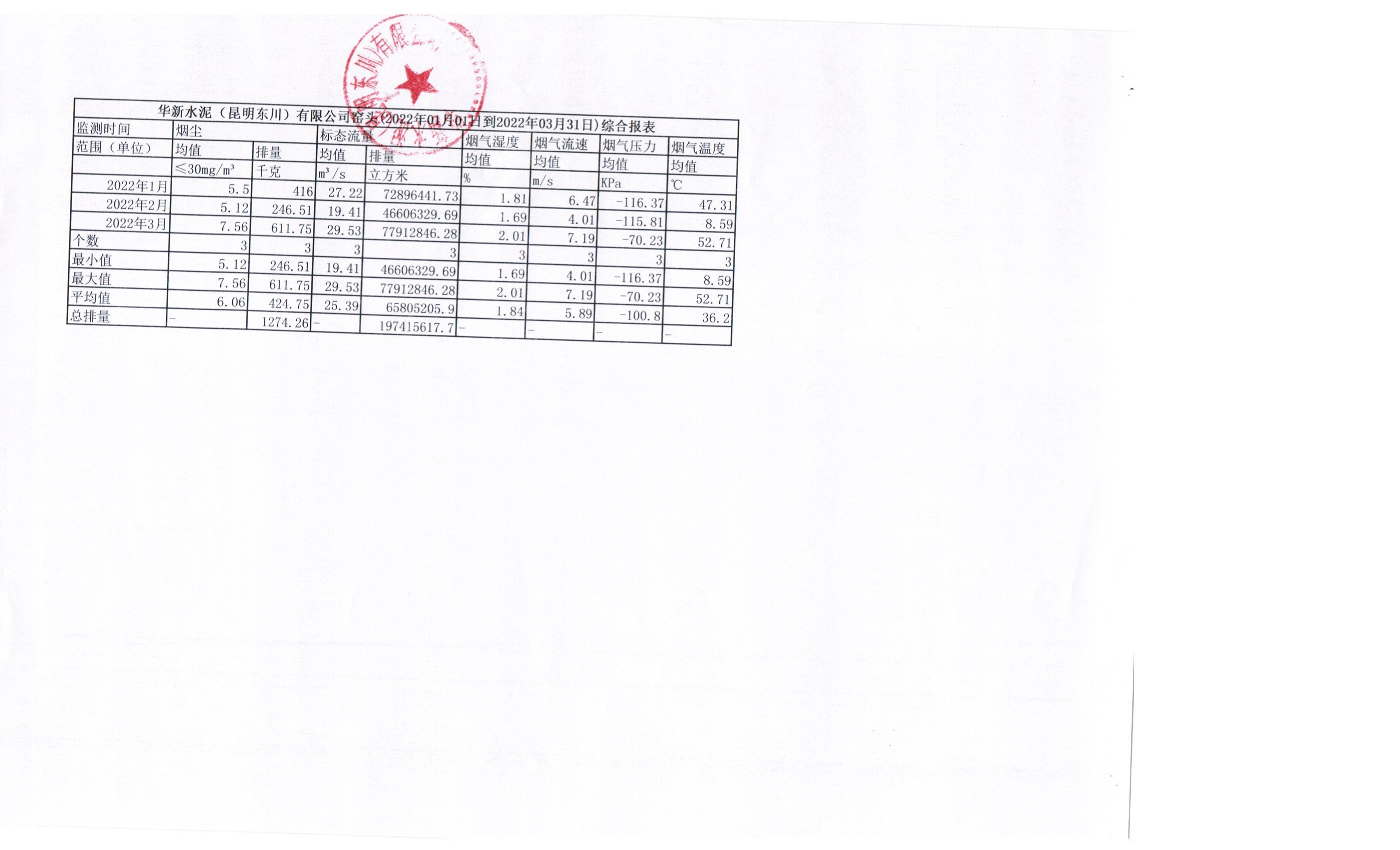 3、華新水泥(昆明東川)有限公司2022年第一季度窯頭煙氣在線監(jiān)測(cè)月平均值季報(bào)表